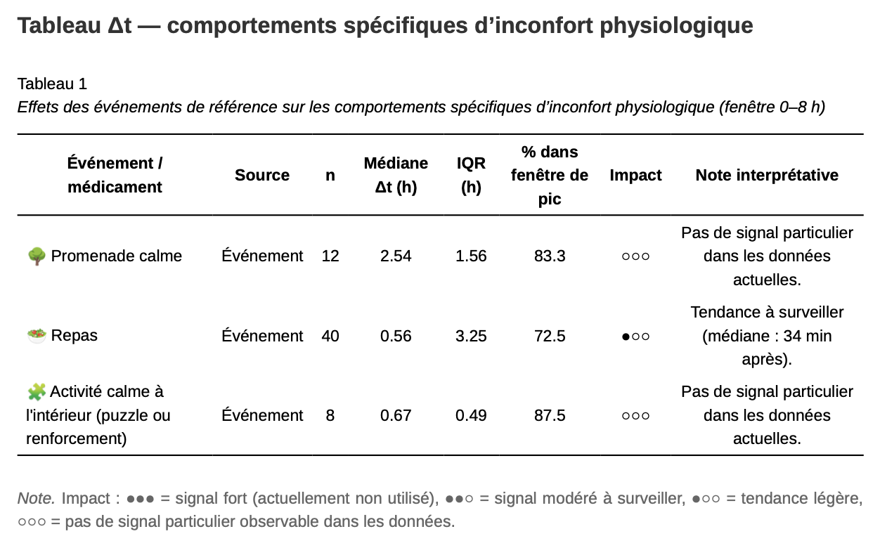 S’il en a la possibilité, il va ensuite proposer aussi d’autres analyses, comme analyser les jours avec et les jours sans un événement / médicament, pour voir si il y a une différence. On va par exemple remarquer que notre chien est plus agité les jours où on a fait des activités sportives intenses que les journées calmes. Attention toutefois à rester critique sur les corrélations, et à ne pas les prendre erronément pour des causalités (c’est parfois le cas, parfois pas): évidemment, on va voir plus d’inconforts les jours où on a donné un pansement gastrique… puisqu’on a justement donné le pansement gastrique parce qu’il y avait des inconforts.